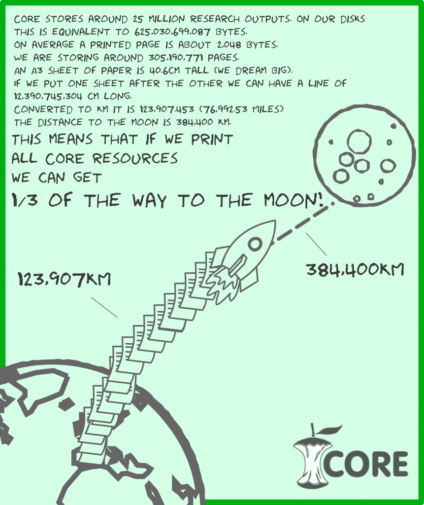 Finally, we calculated where CORE’s collection would take us if we had printed all the full-text from our database in a A3 page. We discovered that all this paper would take us 1/3 of the way to the moon.