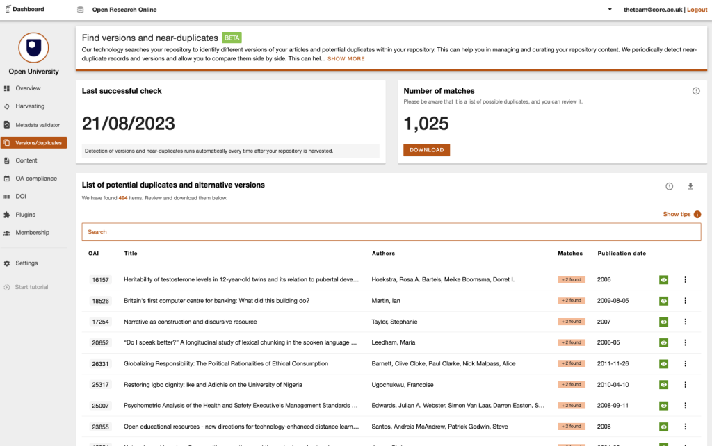 The Versions and Duplicates module is one of a range of tools and services delivered by CORE to support the open repositories network. We are continually working to improve what we do and it is by working with, and listening to, our members that we can best deliver on our mission.