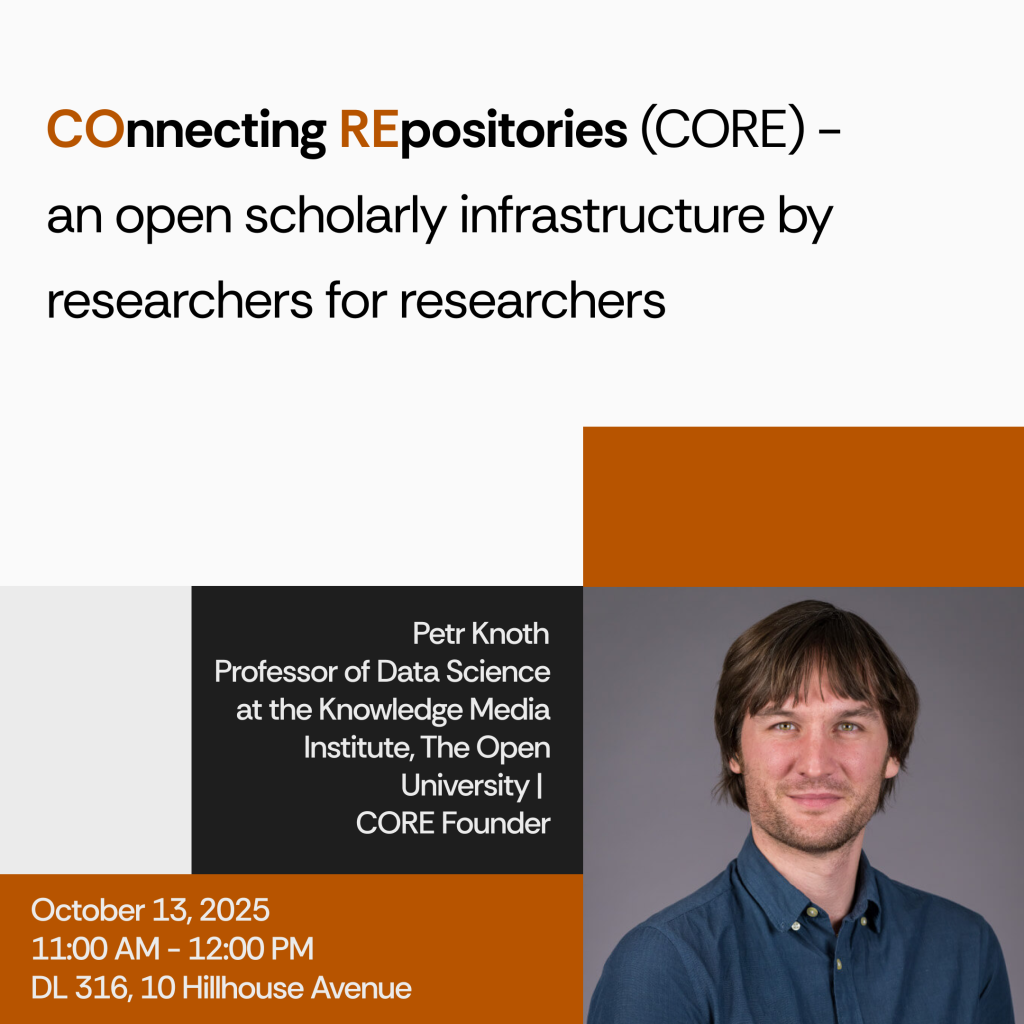 We’re pleased to share that Professor Petr Knoth, Founder and Head of CORE (core.ac.uk) and Professor of Data Science at The Open University’s Knowledge Media Institute, will be giving a Computer Science Talk at Yale University on 13 October 2025.